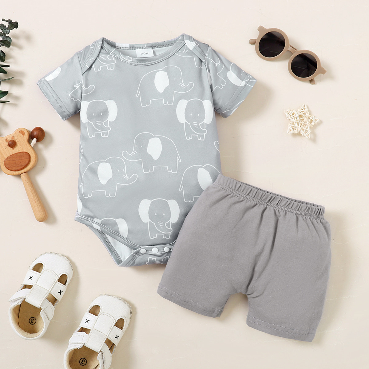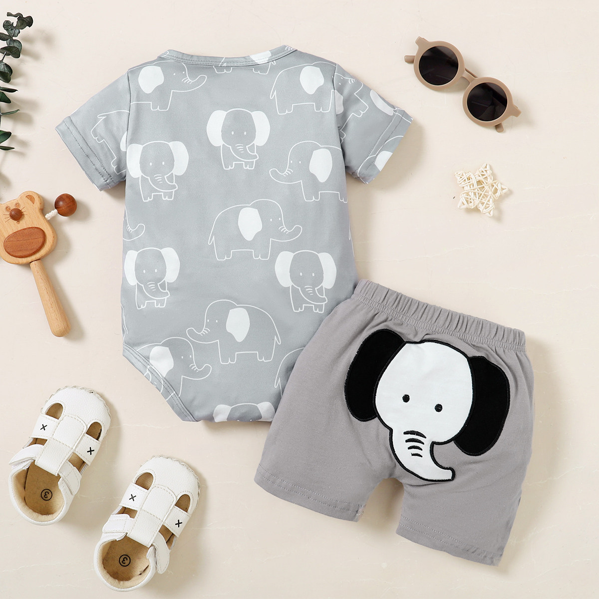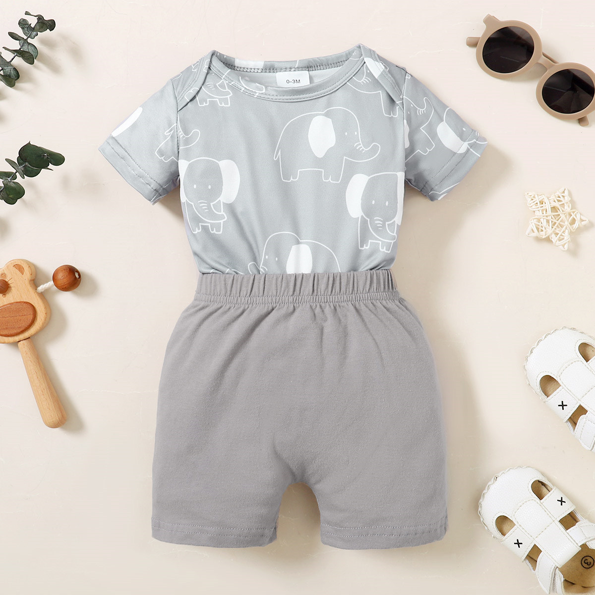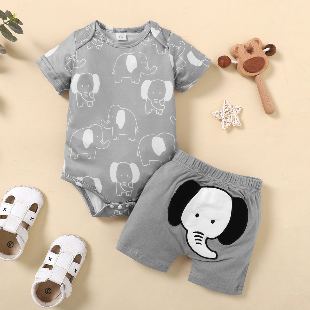 Baby Boy Elephant Pattern Bodysuit & Applique Elephant Pattern Shorts Wholesale
