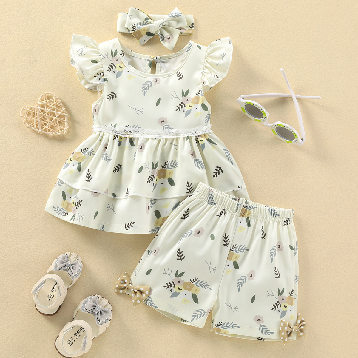 Baby Girl Beautiful Ruffle Sleeve Floral Top And Shorts with Headband Wholesale