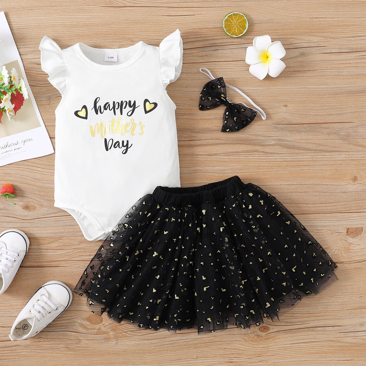Baby Girl Mother's Day Letter Bodysuit And Mesh Skirt with Headband Wholesale
