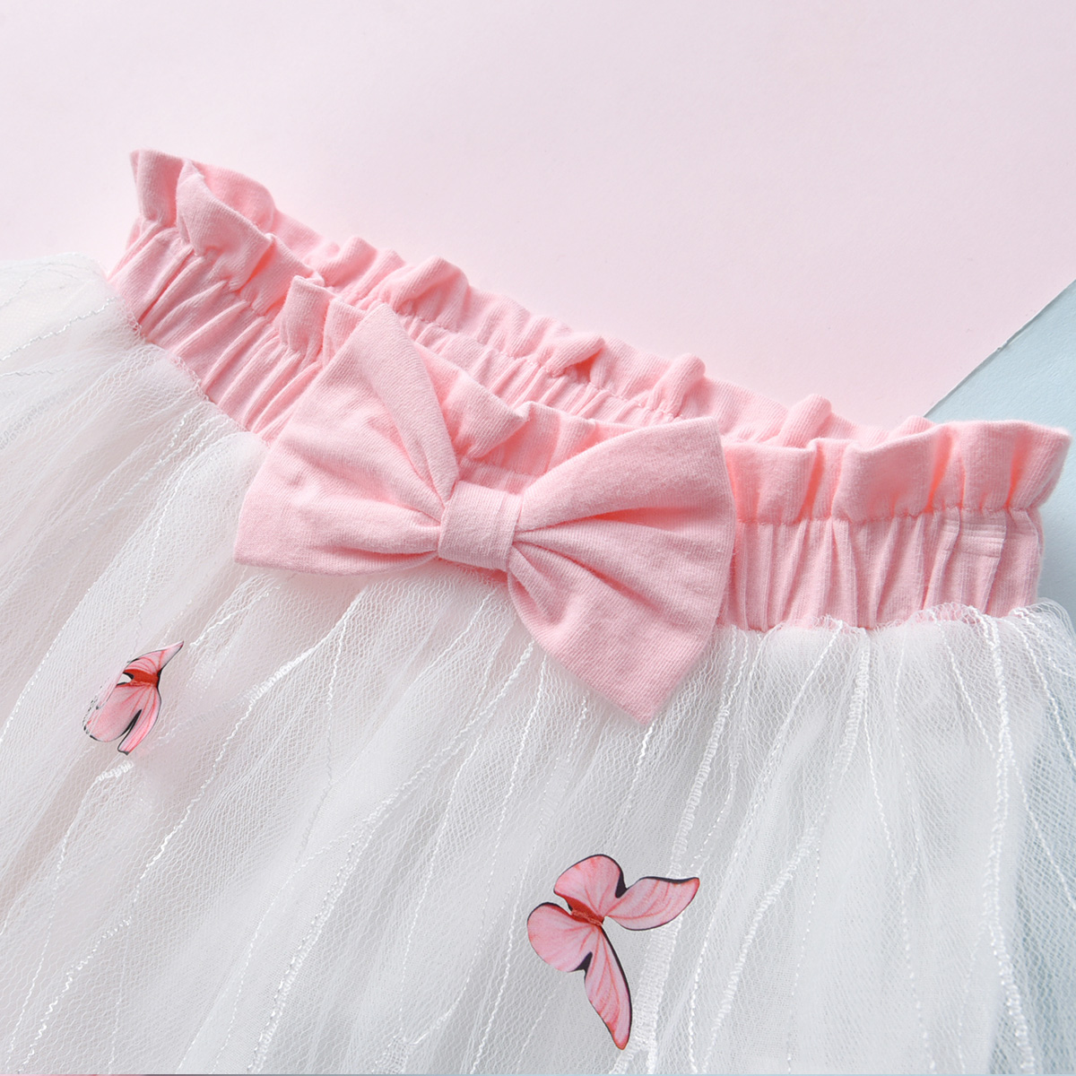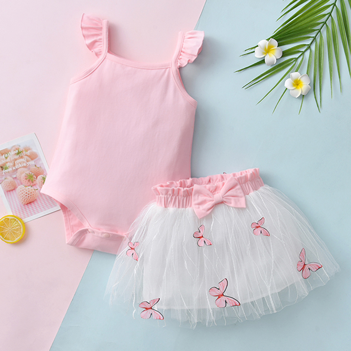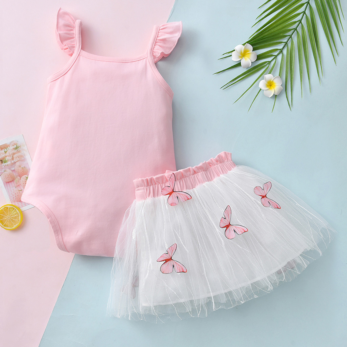 Baby Girl Solid Colour Ruffle-sleeve Bodysuit And Butterfly Mesh Skirt Wholesale