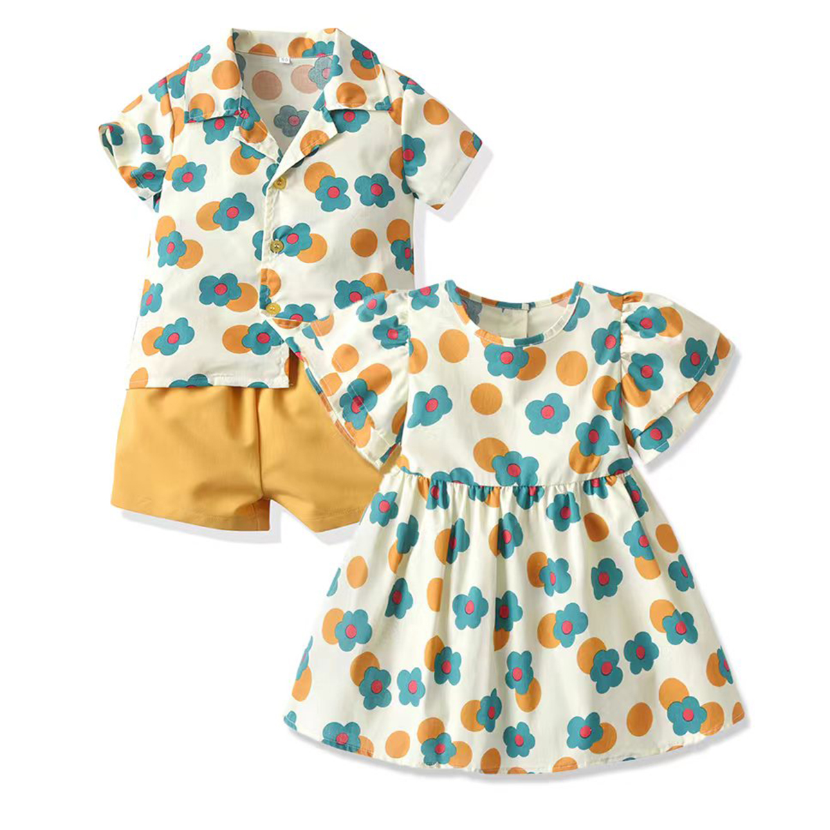 Floral Print Short Sleeve Dress & Blouse and Shorts Suit for Brother and Sister Wholesale
