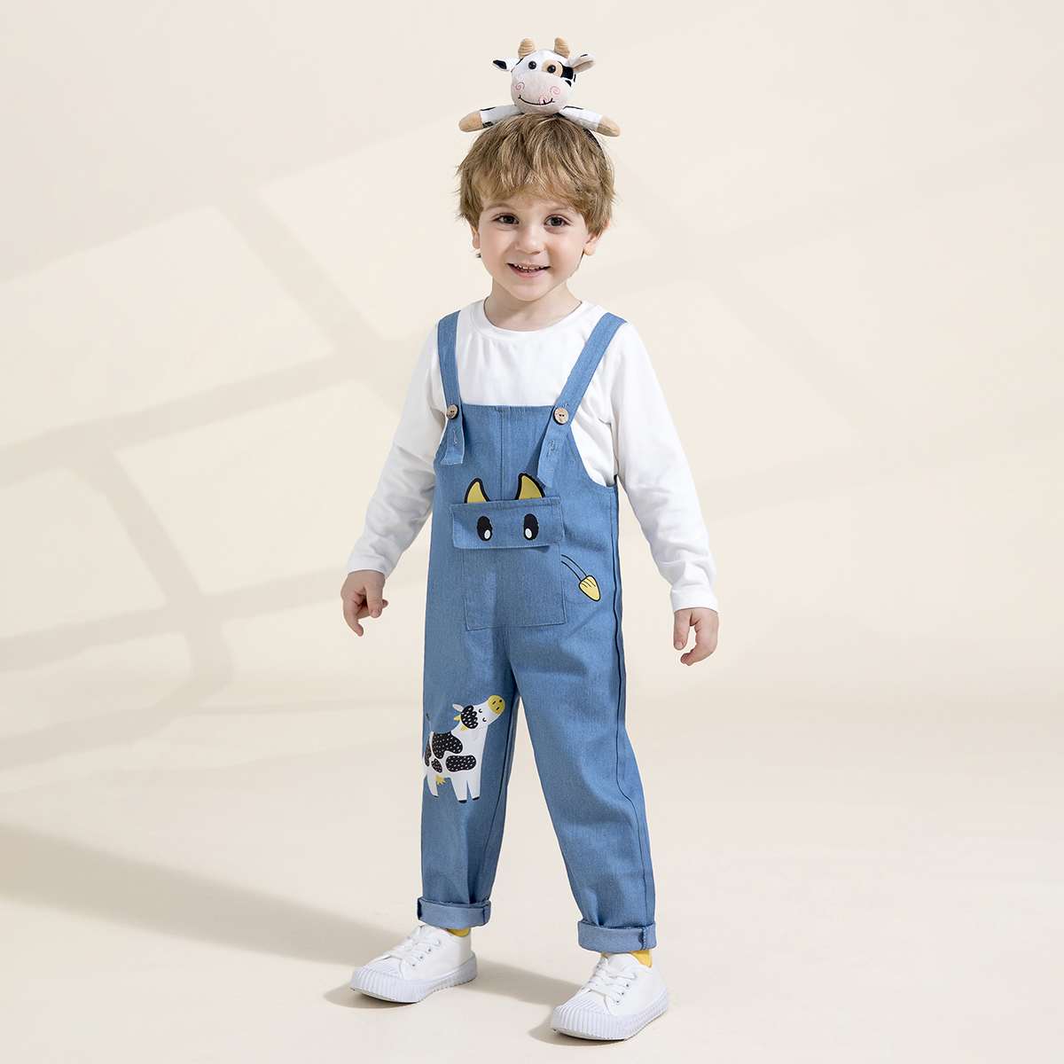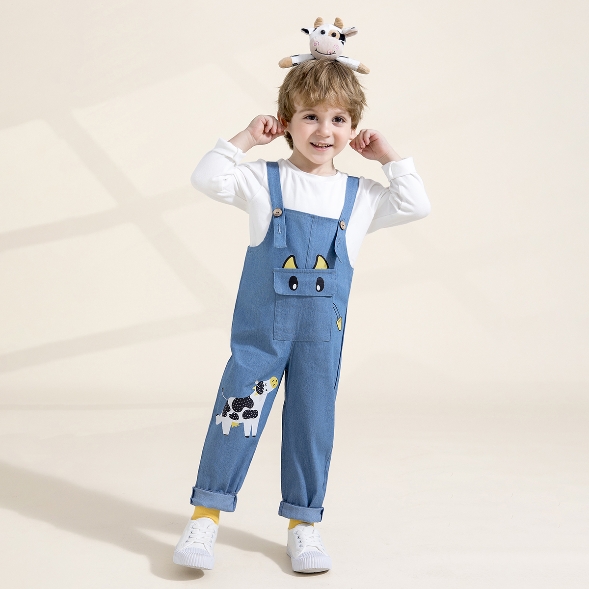 Toddler Boy Cute Dairy Cows Print Denim Strappy Trousers Suit Wholesale