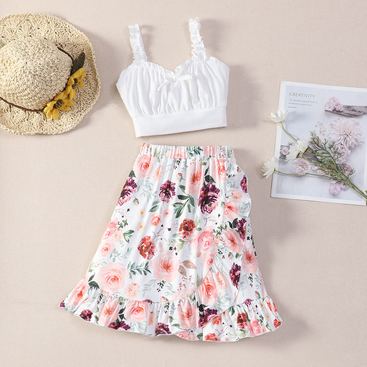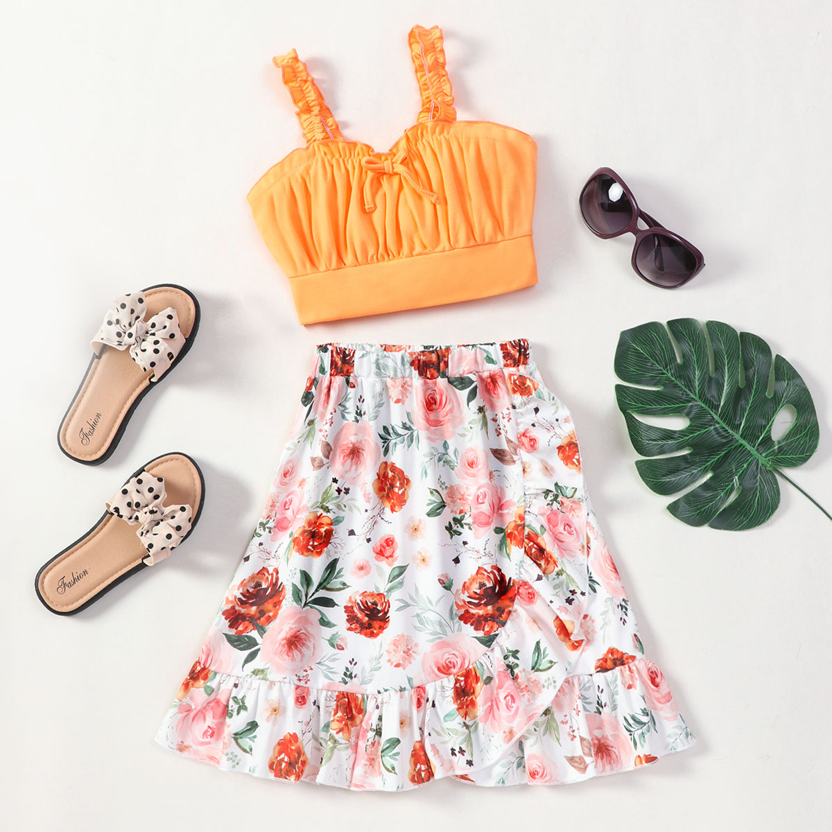 Kid Girl Solid Color Suspenders Top & Floral full print A-line skirt Suit Wholesale
