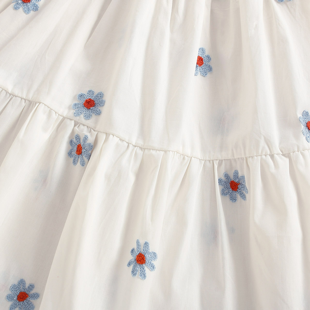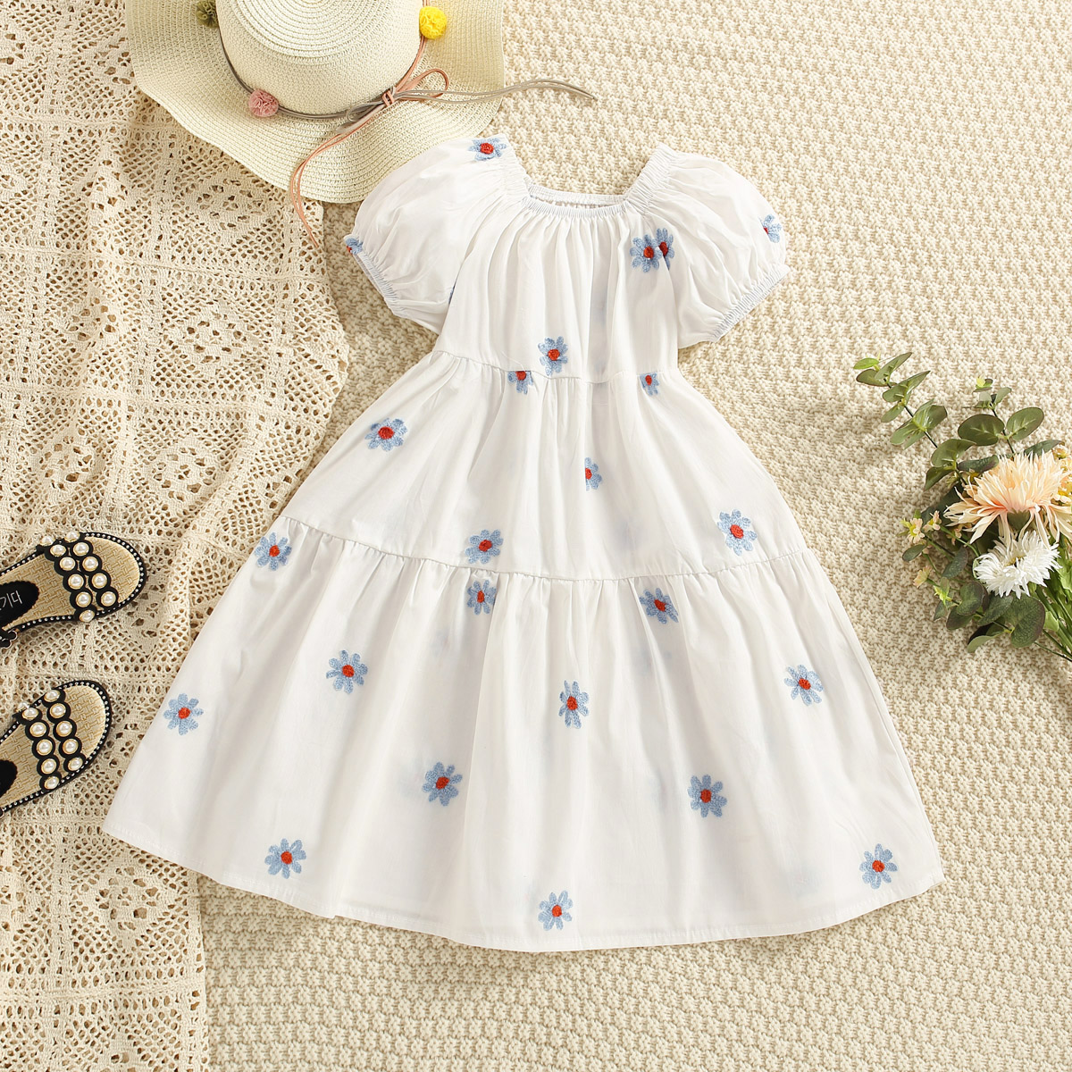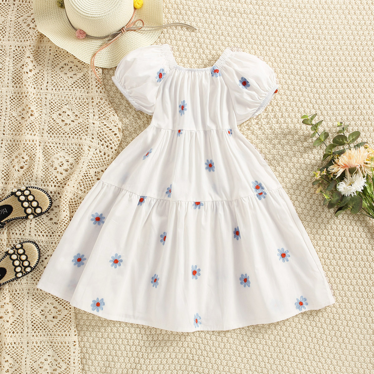 Kids Girls Lantern Sleeve Cotton Embroidered Flower Princess Dress Wholesale