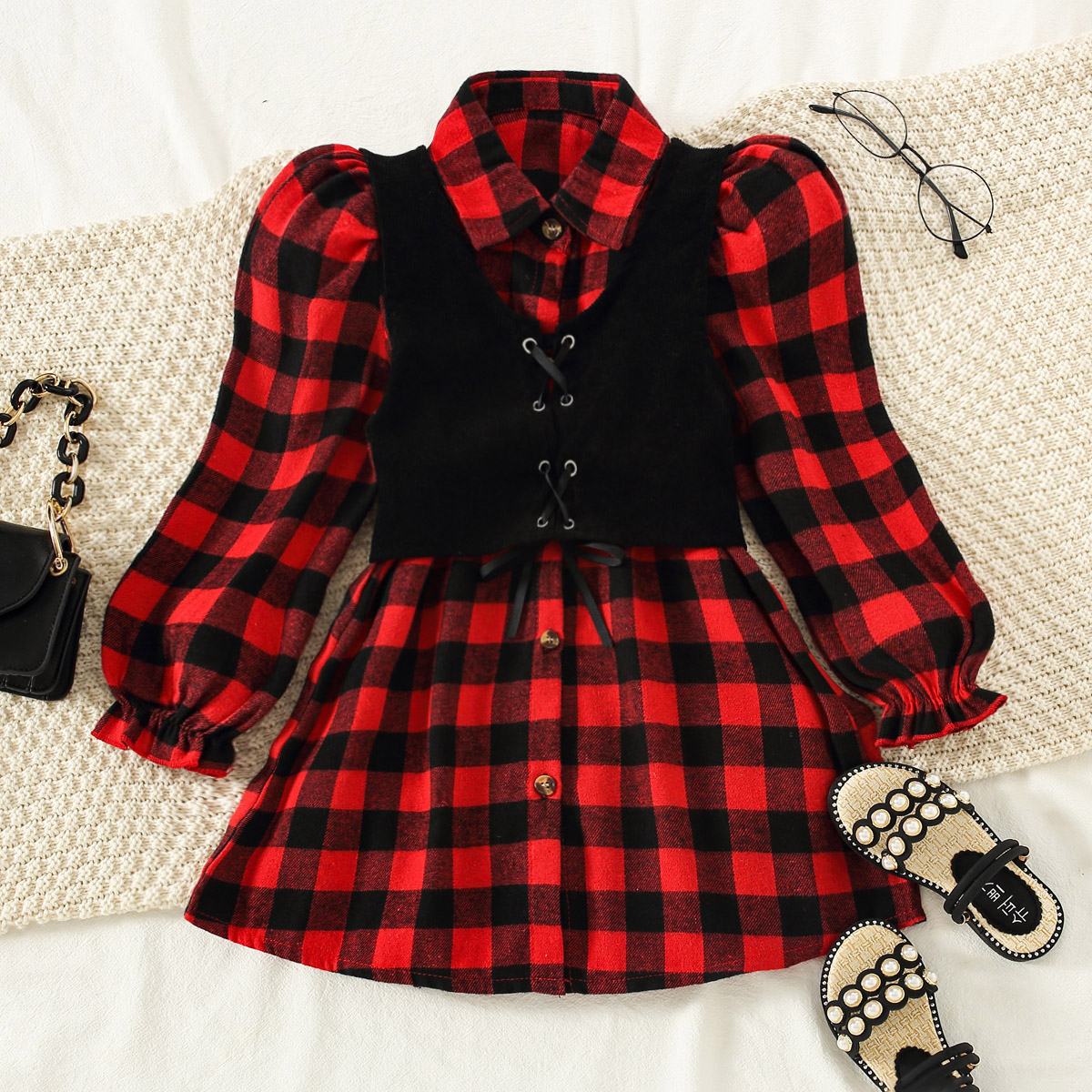 Kids Girls Solid Drawstring Vest & Plaid Print Flounce Sleeve Blouse Wholesale
