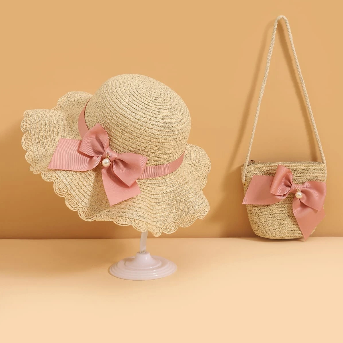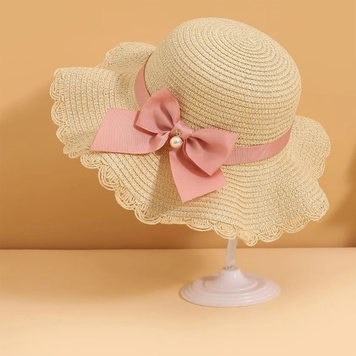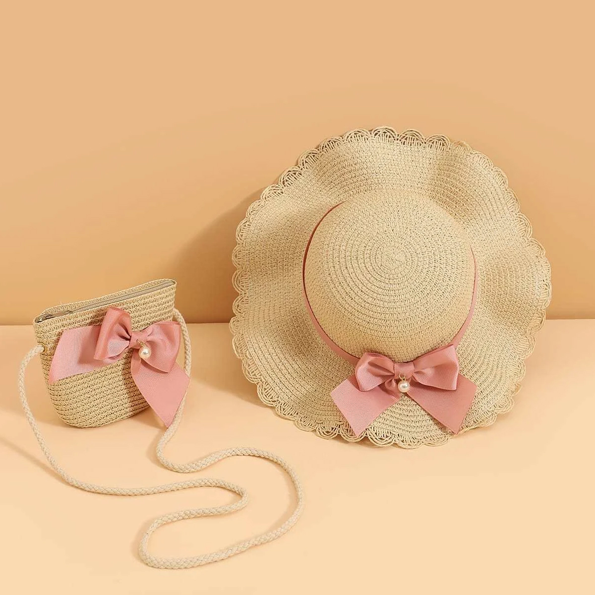 Toddler Girl 2-Pieces Pearl Bow Straw Hat Wholesale