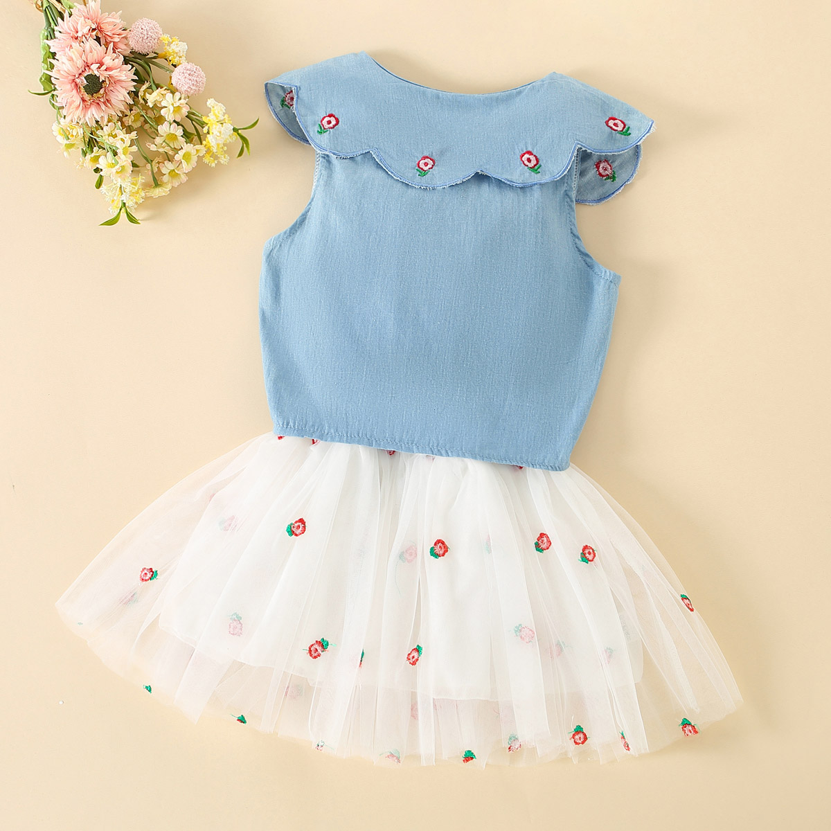 Toddler Girls Ruffled Floral Single-breasted Mesh Top & Skirt Wholesale