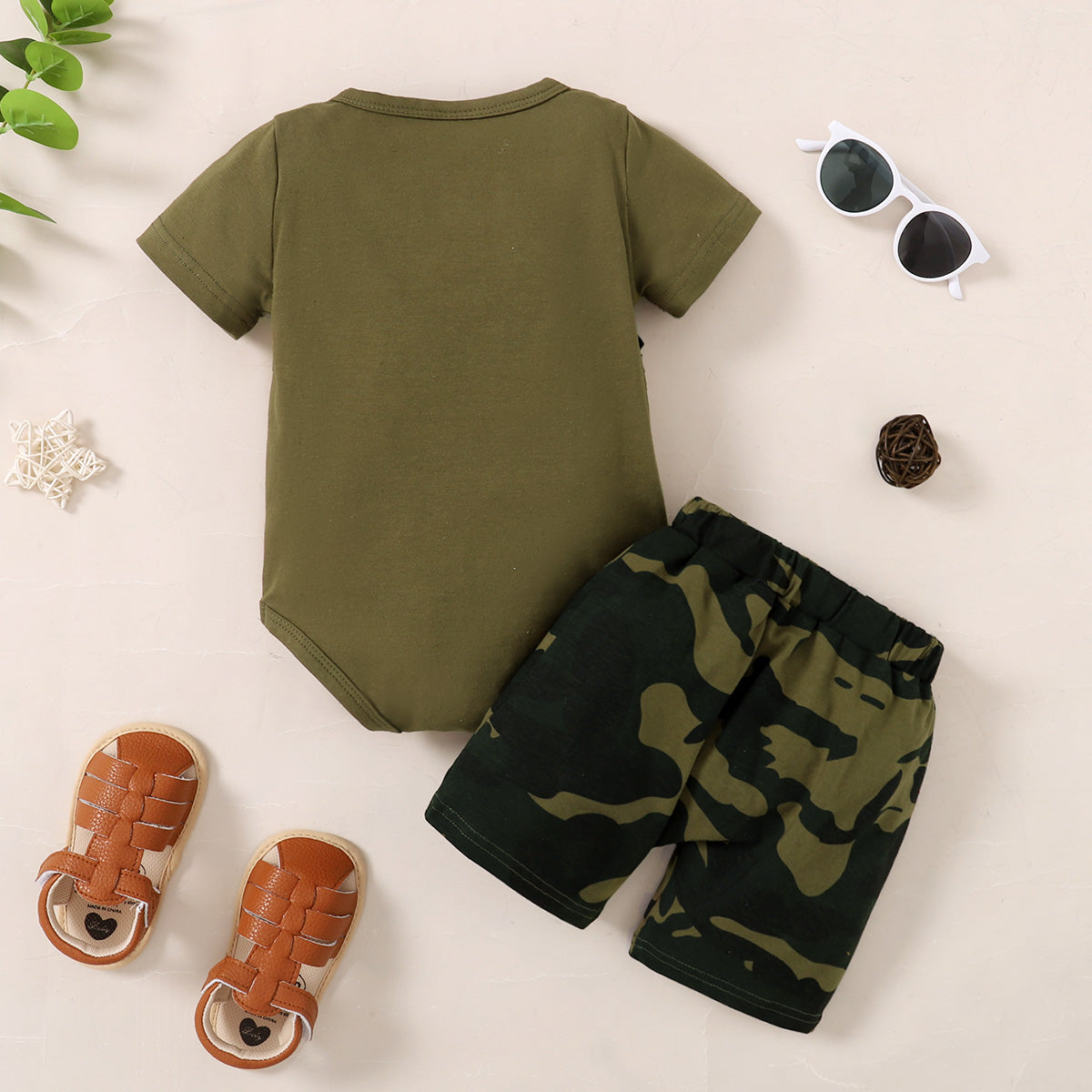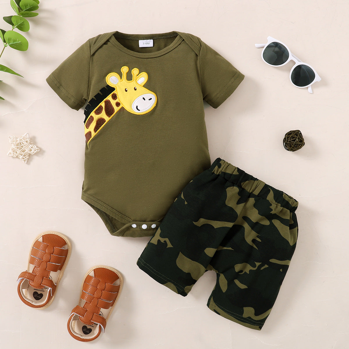 Baby Boy Applique Giraffe Pattern Bodysuit & Camouflage Shorts Wholesale