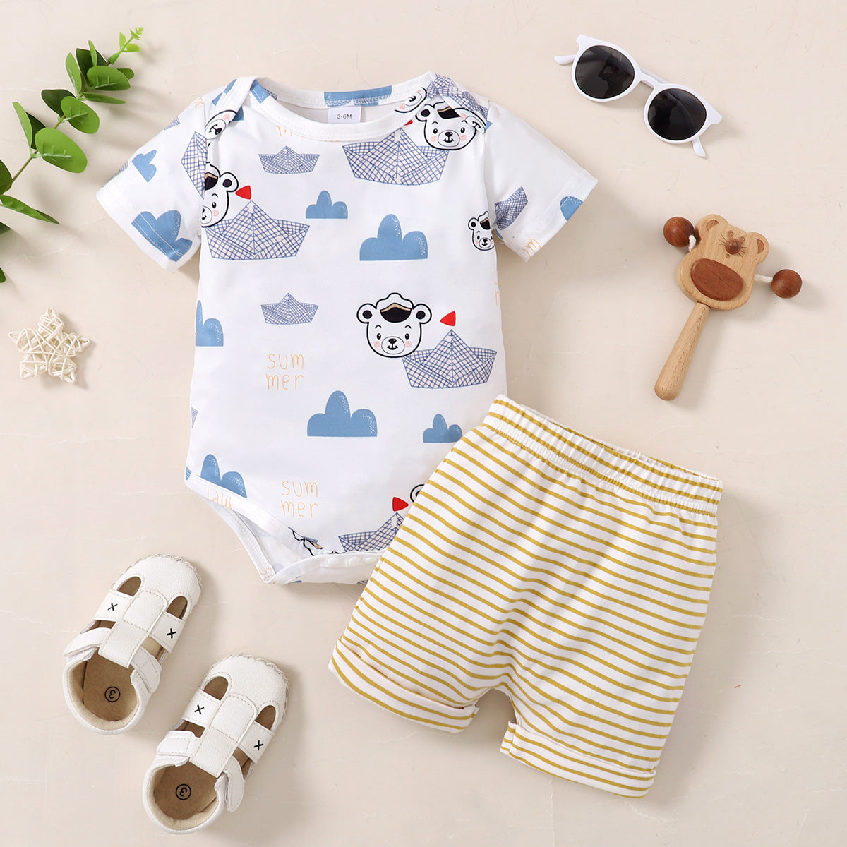Baby Boy Bear Cloud Pattern Bodysuit & Back Applique Bear Stripes Shorts Wholesale