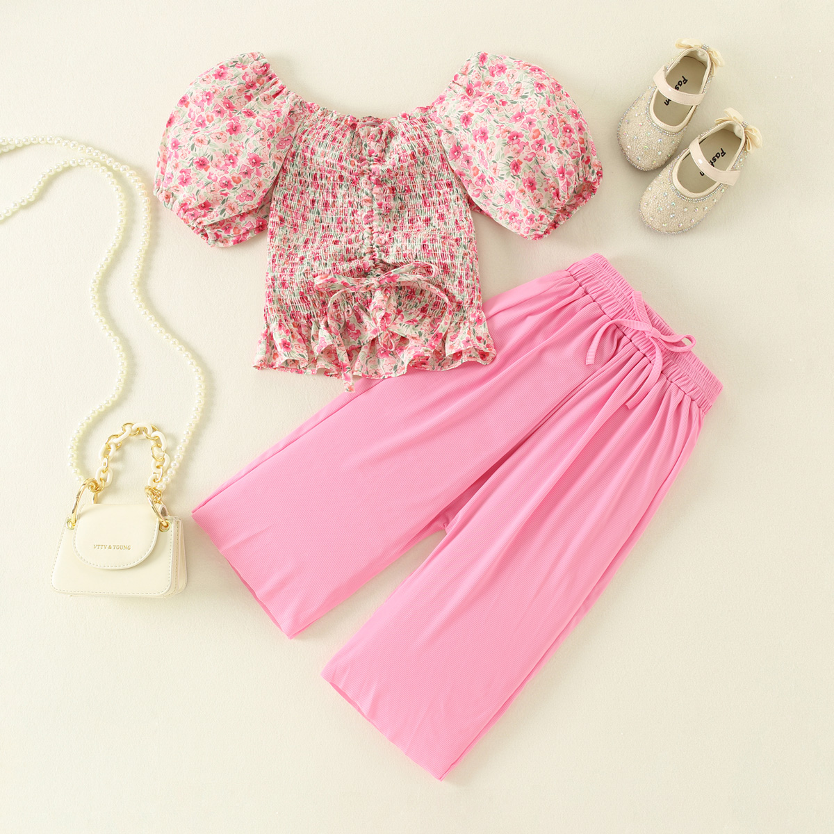Toddler Girls Floral Pleats Puff Sleeve Top & Cropped Pants Wholesale
