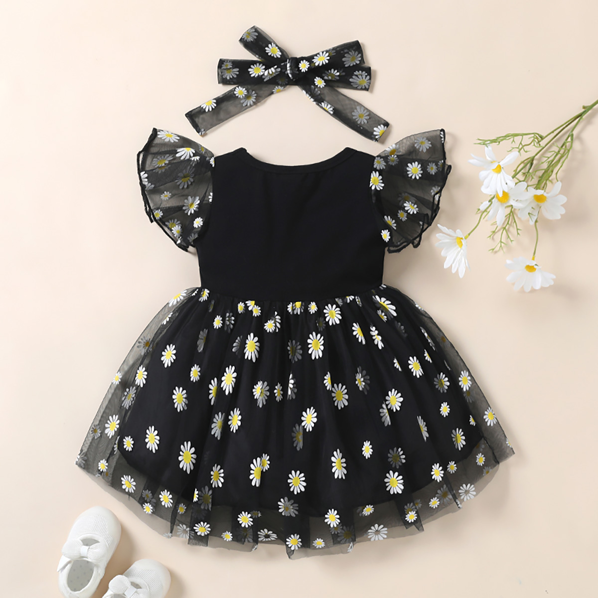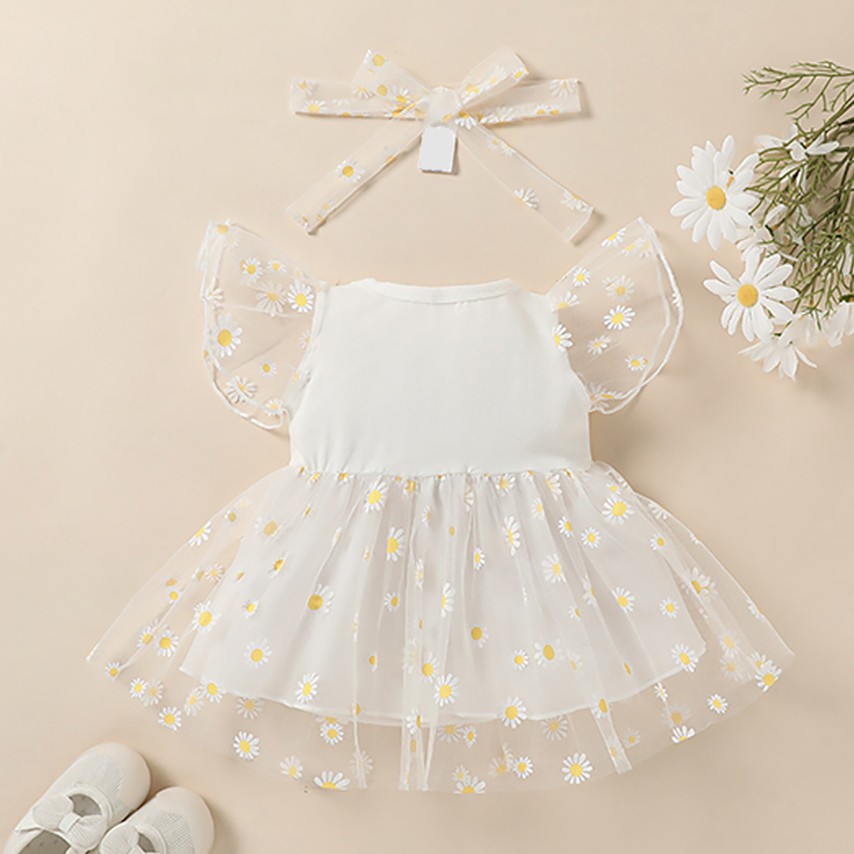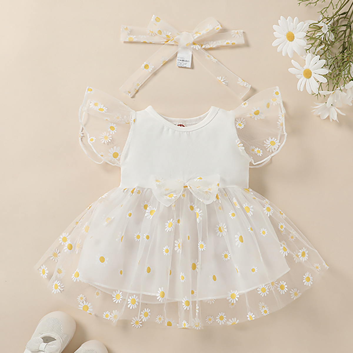 Baby Girl Beautiful Mesh Ruffle Sleeve Floral Print Dress with Headband Wholesale