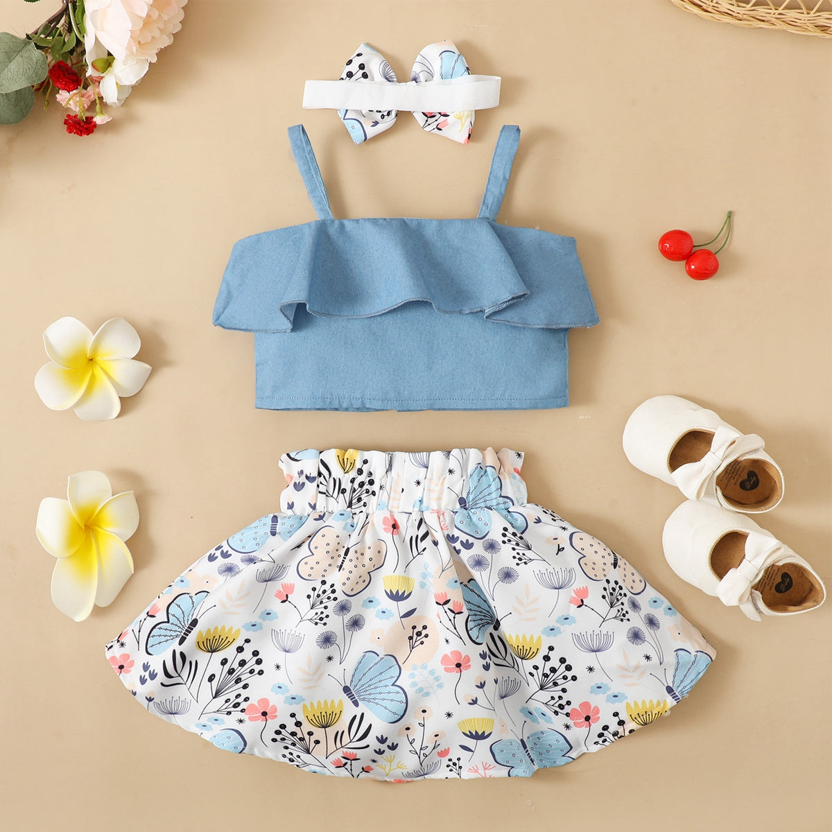 Baby Girl Beautiful Solid Ruffle Top And Floral Skirt with Headband Wholesale