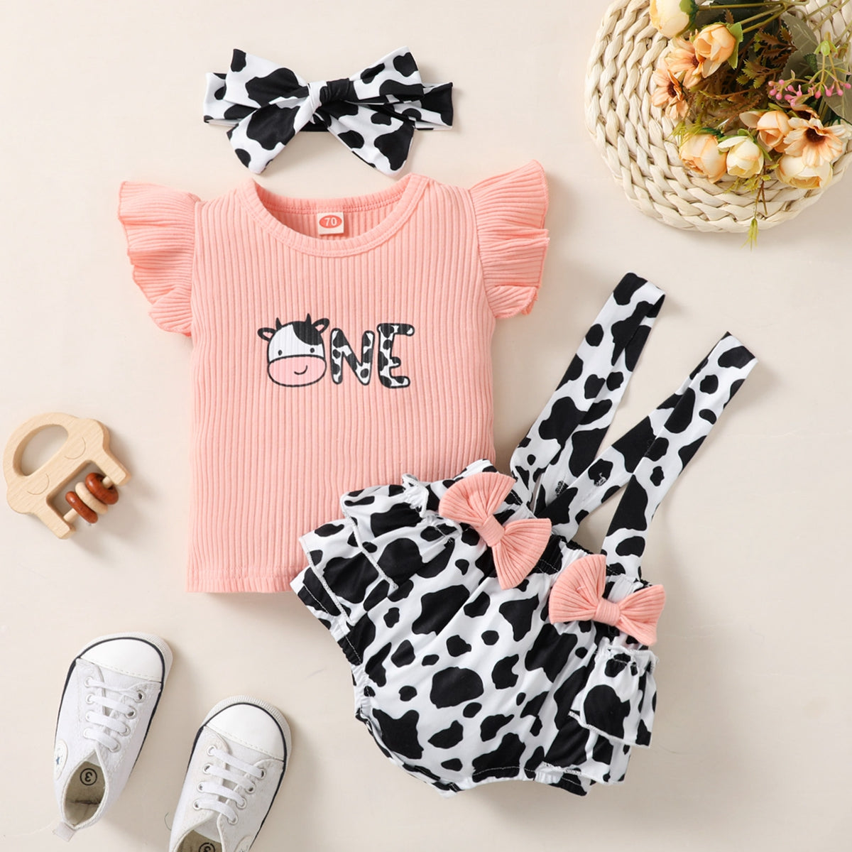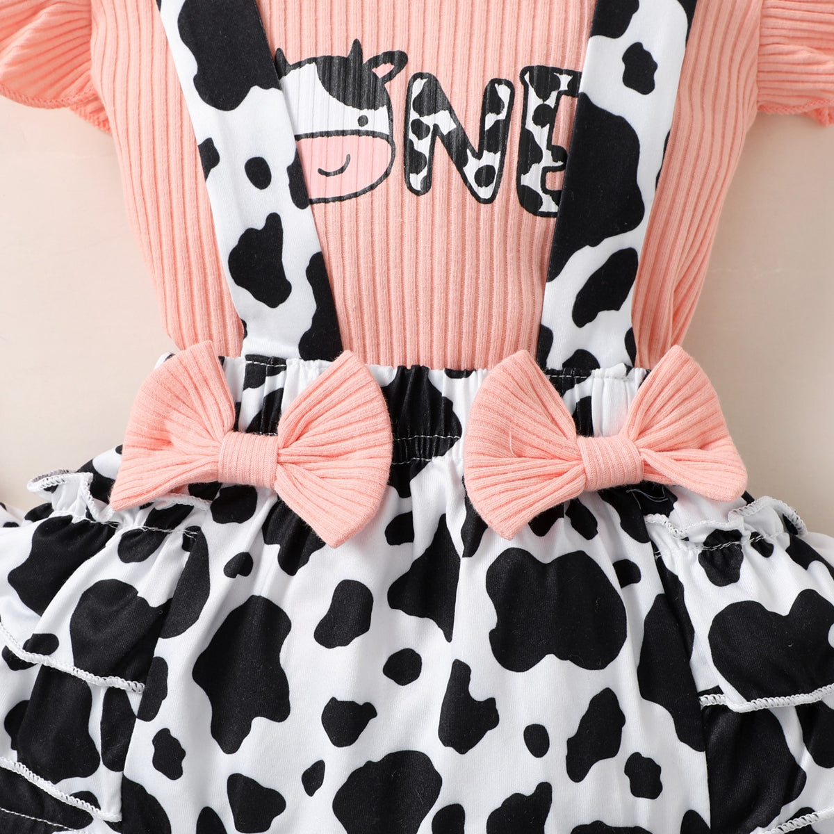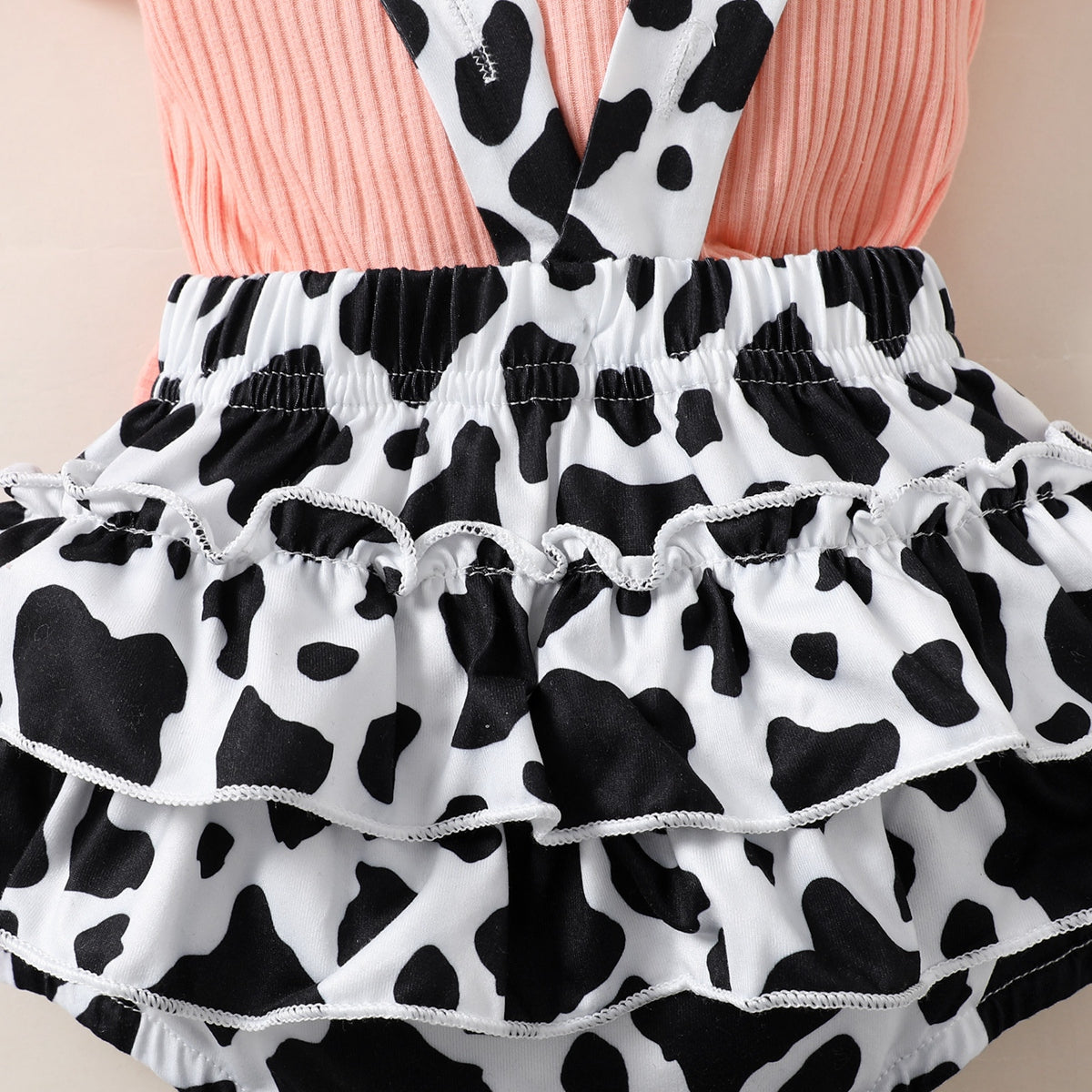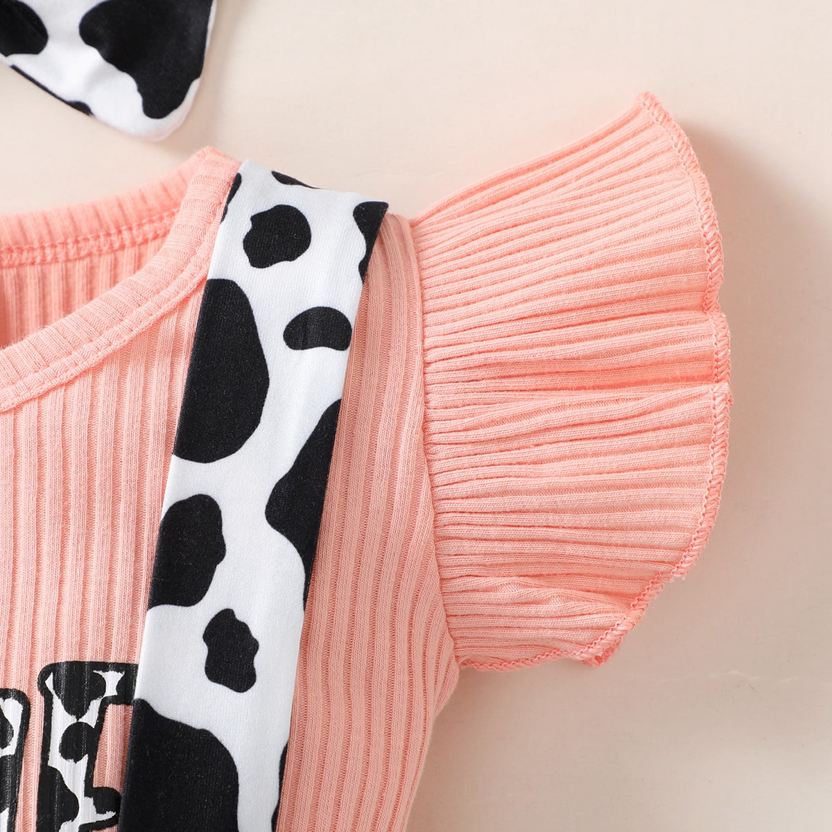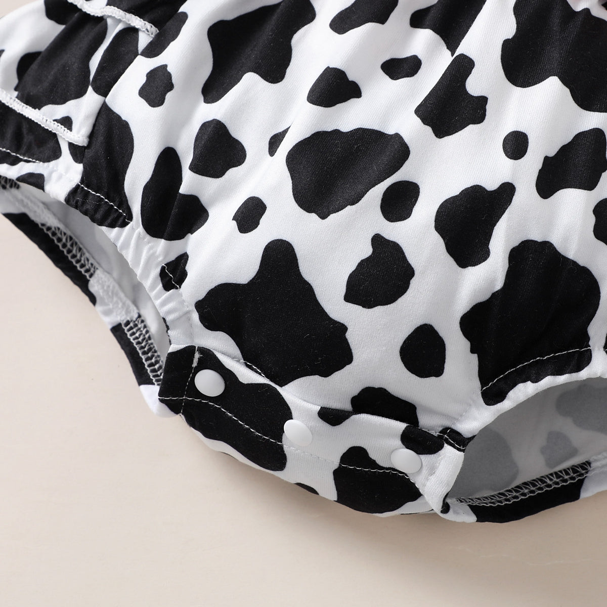 Baby Girl Cute Cattle Print Top And Cow Pattern Overalls Shorts with Headband Wholesale