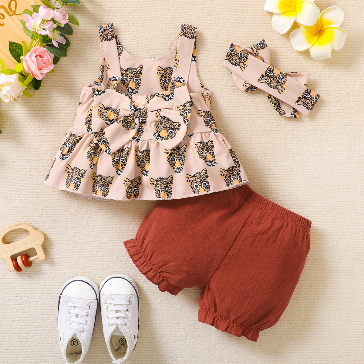 hibobi Baby Girl Cute Animal Print Vest Trousers Hairband Three Pieces Wholesale