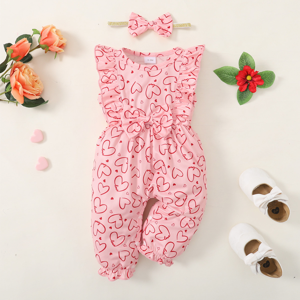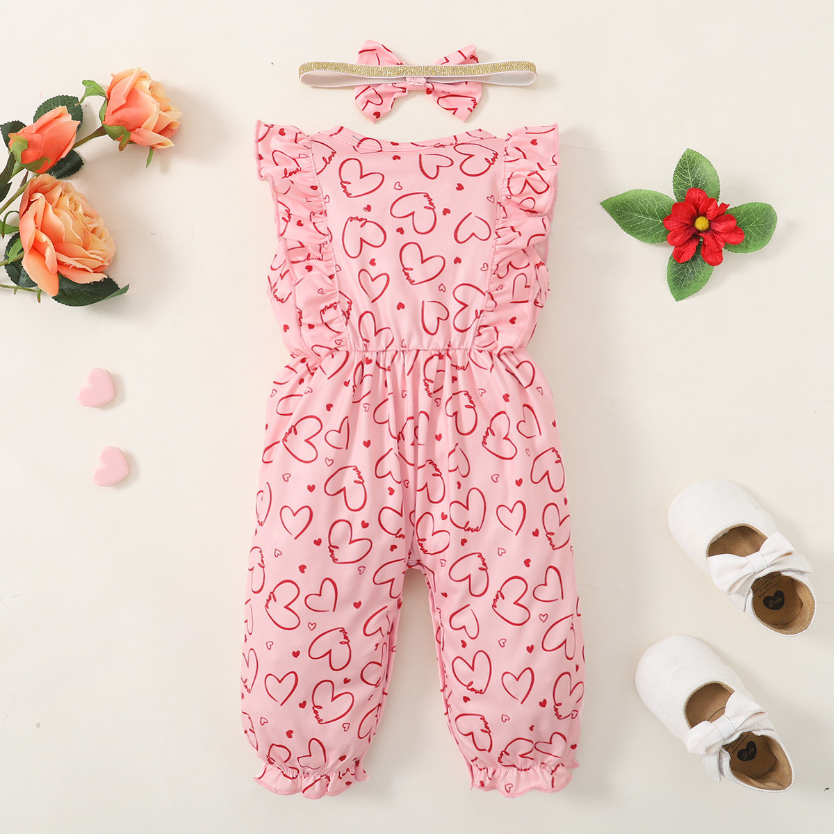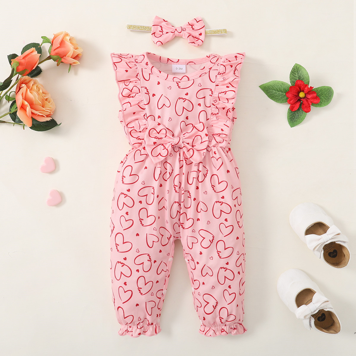 Baby Girl 2 Pieces Heart-shaped Pattern Jumpsuit & Bow-knot Headband Wholesale