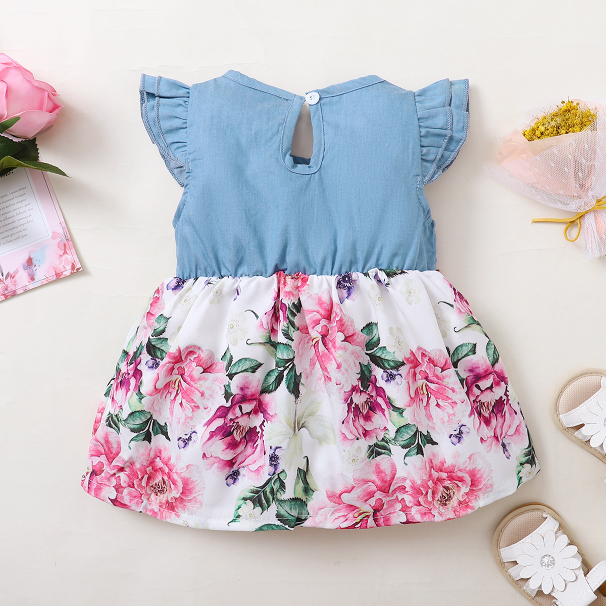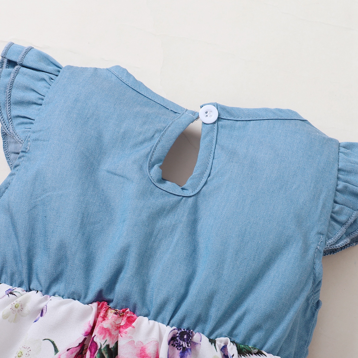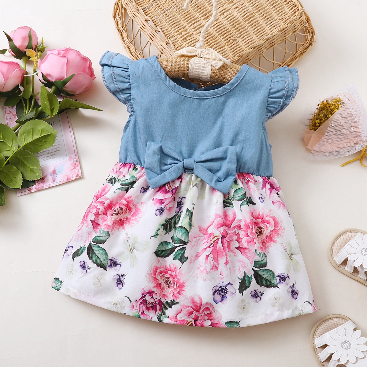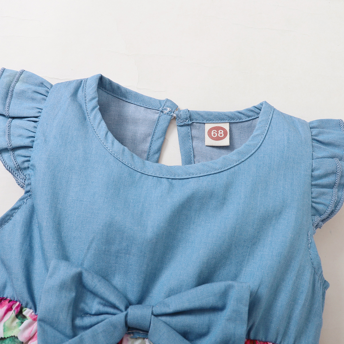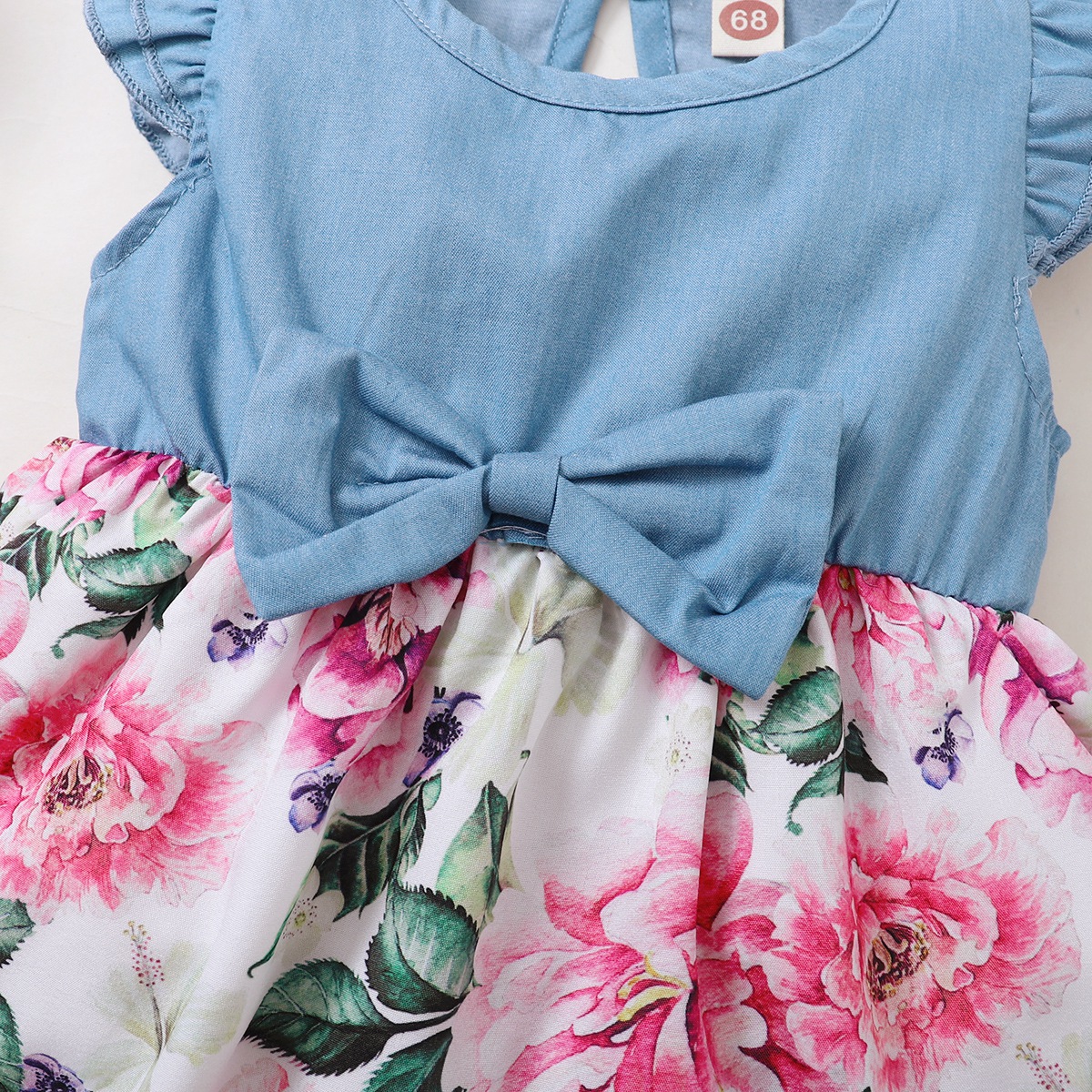Baby Girl Solid Colour Ruffle-sleeve Patchwork Floral Bowknot Dress Wholesale