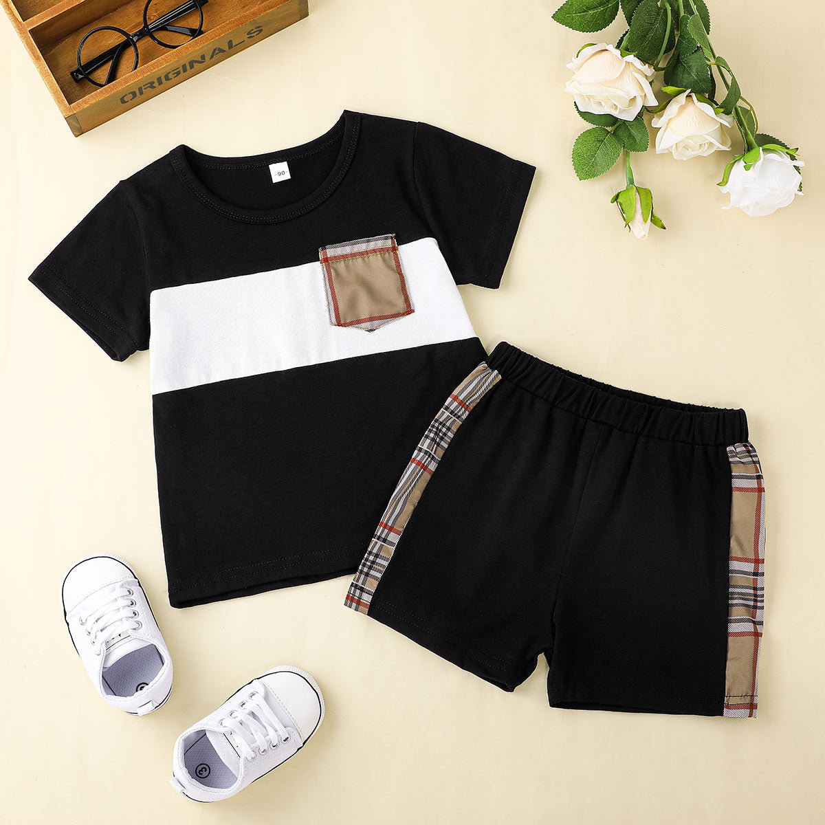 Toddler Boy Plaid Fabric Blocking Casual T-shirt & Shorts Wholesale