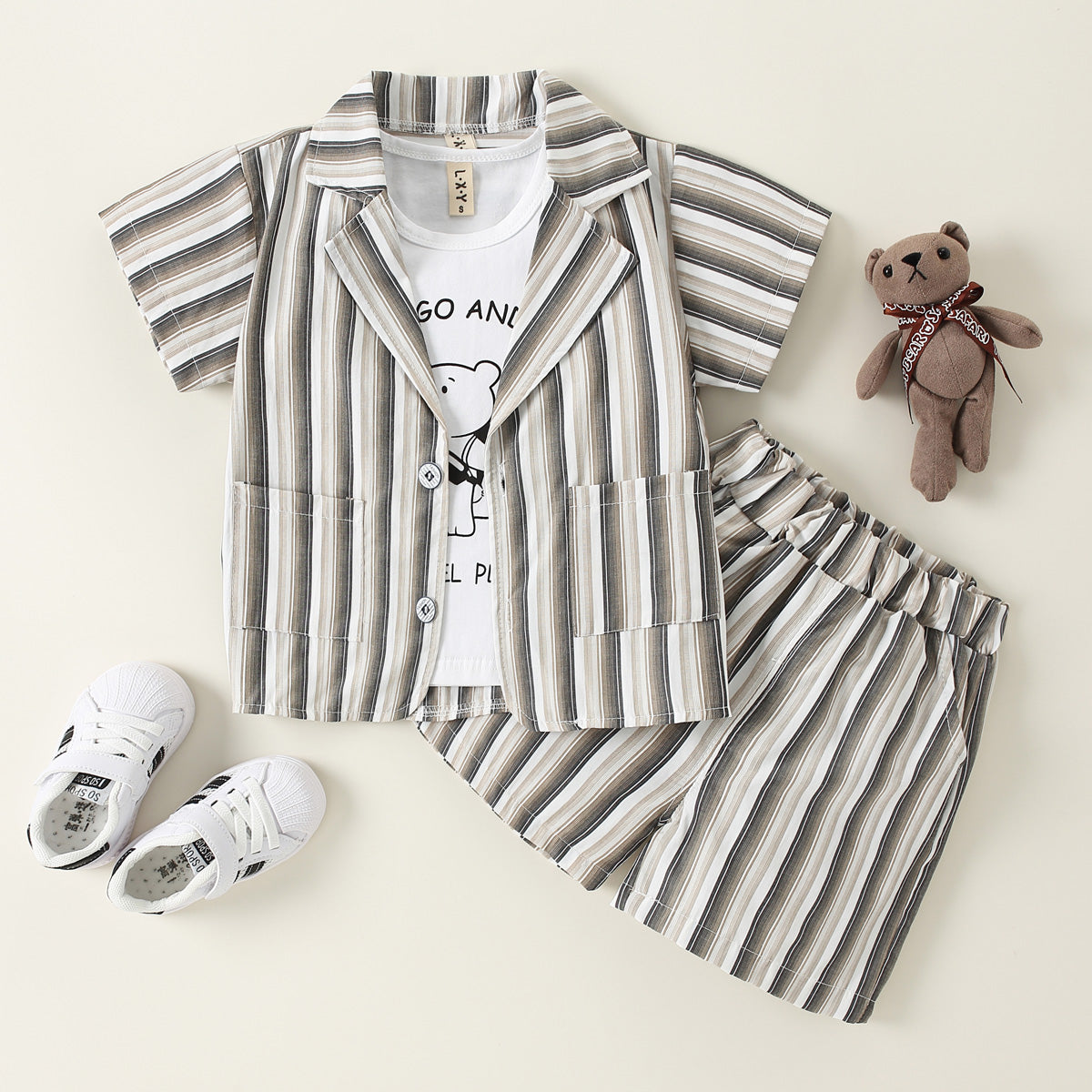 Toddler Boy Cartoon Pattern Short sleeved T-shirt & Stripes Suit & Stripes Shorts Wholesale