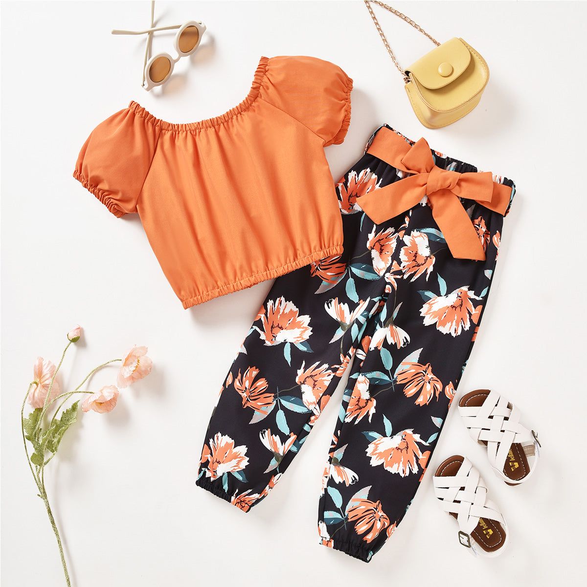 Toddler Girls Slash Neck Floral Solid Top & Pants Wholesale